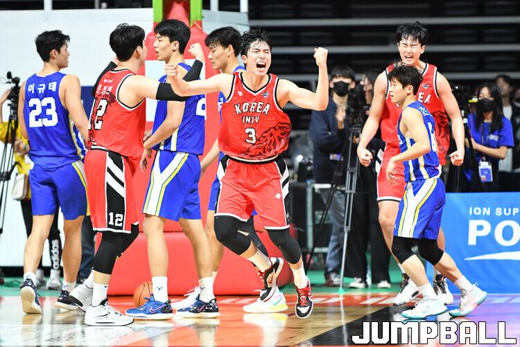 28일 고양실내체육관에서 열린 고려대와 연세대의 2022 정기전, 고려대 박무빈이 전반 팀의 마지막 공격이 성공하자 환호하고 있다. [점프볼=고양/유용우 기자]