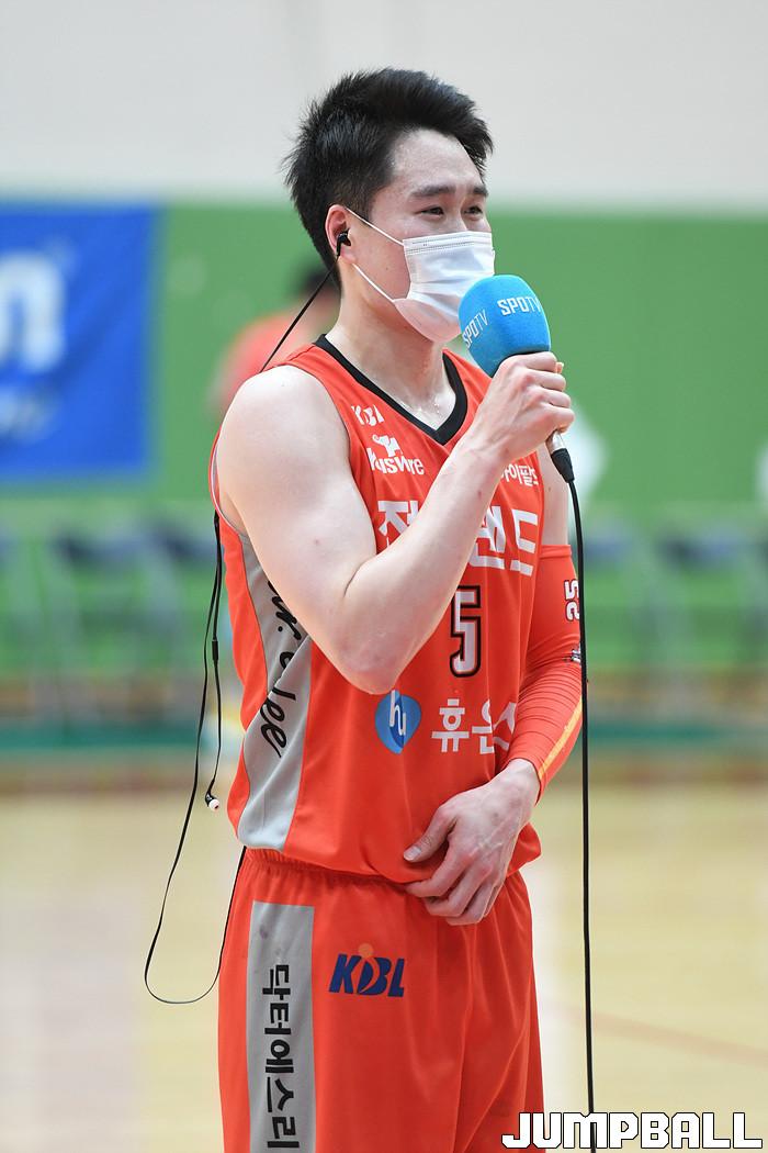[점프볼=이천/박상혁 기자] 11일 이천 LG챔피언스파크에서 열린 2020-2021 현대모비스 프로농구 KBL 가리그 2차대회 인천 전자랜드와 울산 현대모비스의 준결승 경기, 전자랜드 임준수가 경기 종료후 인터뷰를 하고 있다.