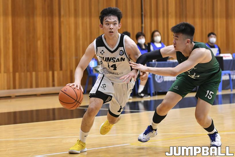 2일 군산고등학교 체육관에서 열린 2022 한국중고농구 주말리그 군산고와 광주고의 경기. 군산고 강건이 드리블 돌파로 골밑으로 향하고 있다.