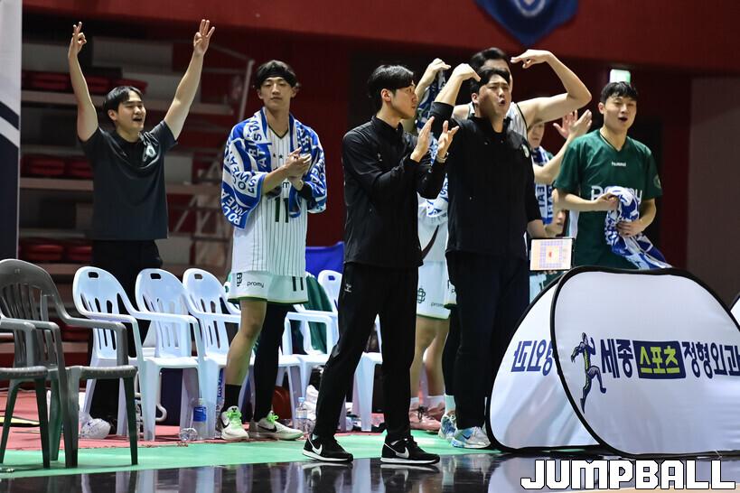 [점프볼=용인/박상혁 기자] 25일 경희대 국제캠퍼스 선승관에서 열린 2025-2026 KBL D리그 고양 소노와 원주 DB의 경기, DB 선수들이 환호하고 있다.