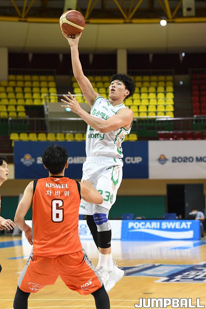 [점프볼=군산/박상혁 기자] 25일 군산월명체육관에서 열린 2020 MG새마을금고 KBL컵 인천 전자랜드와 원주 DB의 경기, DB 배강률이 훅슛을 시도하고 있다.