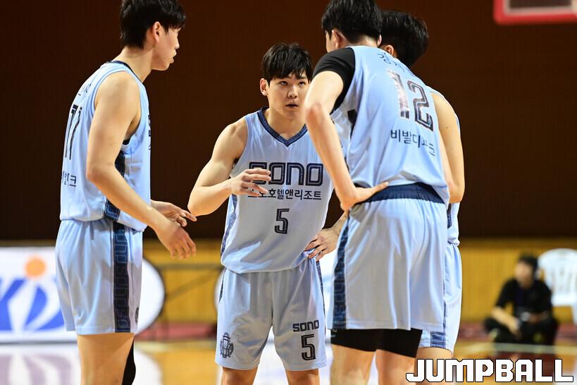 [점프볼=용인/박상혁 기자] 25일 경희대 국제캠퍼스 선승관에서 열린 2025-2026 KBL D리그 고양 소노와 원주 DB의 경기, 소노 조석호가 선수들을 불러모아 대화를 나누고 있다.