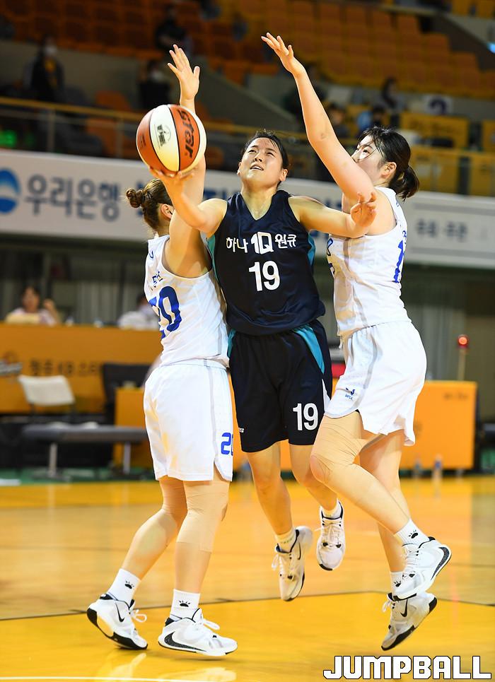 [점프볼=청주/문복주 기자] 17일 청주체육관에서 열린 '2020 우리은행 박신자컵 서머리그' 하나원큐와 삼성생명의 경기, 하나원큐 김두나랑이 두명의 수비를 뚫고 슛을 시도하고 있다.