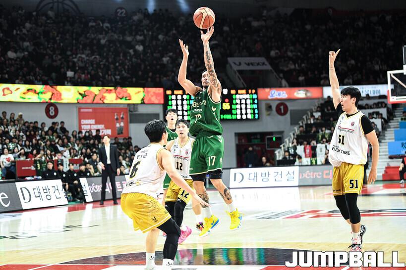 원주 DB는 25일 안양 정관장 아레나 2025-2026 LG전자 프로농구 정규시즌 안양 정관장과의 세 번째 맞대결에서 69-63으로 이겼다. 14승 10패(4위)가 되면서 3위 정관장(16승 9패)에 1.5경기차로 따라 붙었다.