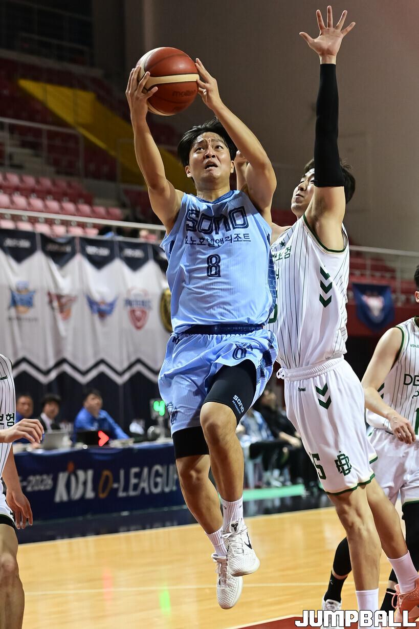 [점프볼=용인/박상혁 기자] 25일 경희대 국제캠퍼스 선승관에서 열린 2025-2026 KBL D리그 고양 소노와 원주 DB의 경기, 소노 김도은이 레이업슛을 시도하고 있다.
