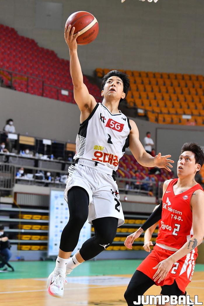 17일 경상북도 상주시 상주실내체육관에서 열린 2021 MG새마을금고 KBL컵 대회 수원 KT와 서울 SK의 4강 경기, KT 허훈이 레이업을 올려넣고 있다.