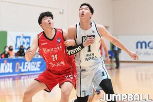 26일 경기도 이천에 위치한 LG 챔피언스파크에서 열린 2021-2022 KBL D리그 대구 한국가스공사와 전주 KCC의 경기, KCC 송창용과 KCC 서정현이 한국가스공사 이윤기를 더블팀으로 수비하고 있다.