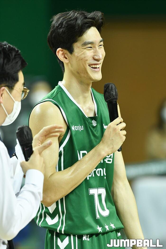 28일 원주 종합체육관에서 열린 2022-2023 SKT 에이닷 프로농구 원주 DB와 전주 KCC의 경기, DB가 89-73으로 KCC에 승리했다. DB 정호영이 팬 인터뷰를 환하게 웃고 있다. [점프볼=원주/유용우 기자]