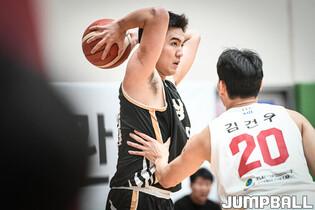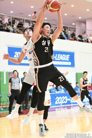 [점프볼=이천/박상혁 기자] 27일 이천 LG챔피언스파크에서 열린 2023-2024 KBL D리그 상무와 SK의 경기, 상무 박진철과 SK 김건우가 리바운드 다툼을 하고 있다.