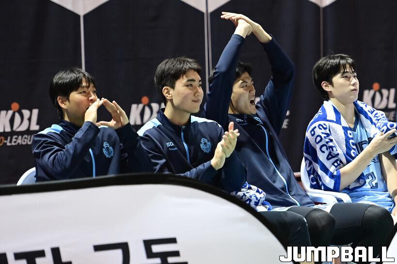 [점프볼=용인/박상혁 기자] 25일 경희대 국제캠퍼스 선승관에서 열린 2025-2026 KBL D리그 고양 소노와 원주 DB의 경기, 벤치에 있는 소노 선수들이 환호하고 있다.