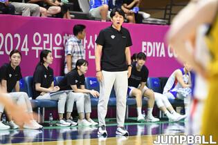 [점프볼=아산/박상혁 기자] 3일 아산 이순신체육관에서 열린 2024 우리은행 박신자컵 우리은행 우리WON과 KB스타즈의 경기, KB스타즈 김완수 감독이 선수들에게 지시를 하고 있다.