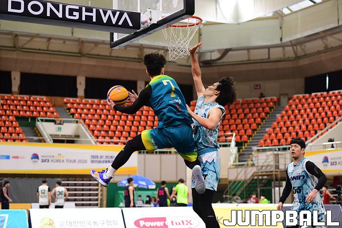 [점프볼=양산/박상혁 기자] 25일 양산실내체육관에서 열린 ' KBA 2020 코리아투어 양산대회' 1일차 경기, 리그전에서 하늘내린인제 박민수가 골밑까지 들어와 패스를 시도하고 있다.