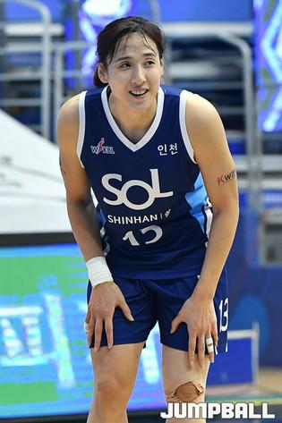 [점프볼=인천/유용우 기자] 17일 인천 도원체육관에서 열린 'KB국민은행 Liiv M 2020~2021 여자프로농구' 신한은행과 삼성생명의 경기, 신한은행 김단비가 동료와 이야기 나누며 웃고 있다.