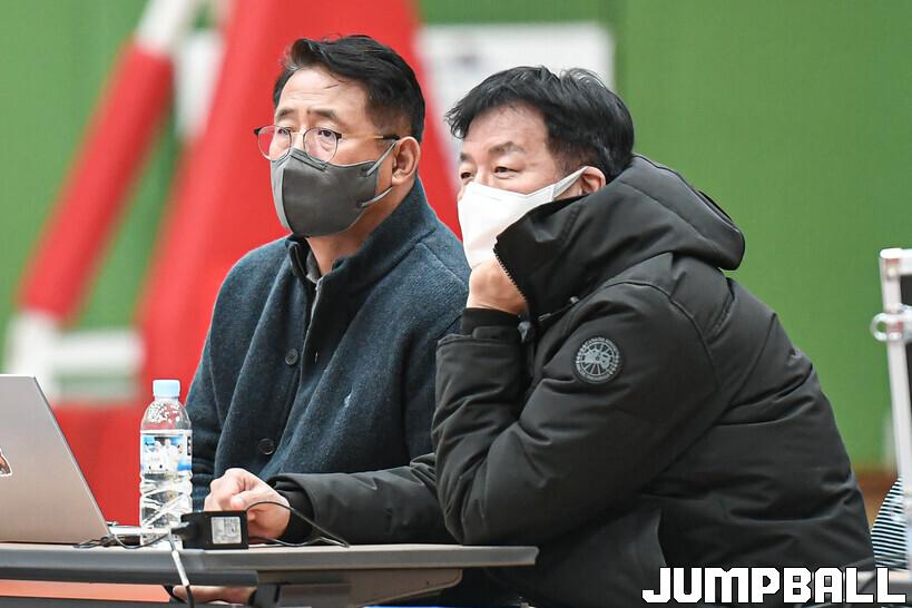 12일 이천 LG챔피언스파크에서 열린 2022-2023 KBL D리그 서울 SK와 상무의 경기, 국가대표 추일승 감독과 이훈재 코치가 경기를 지켜보고 있다.