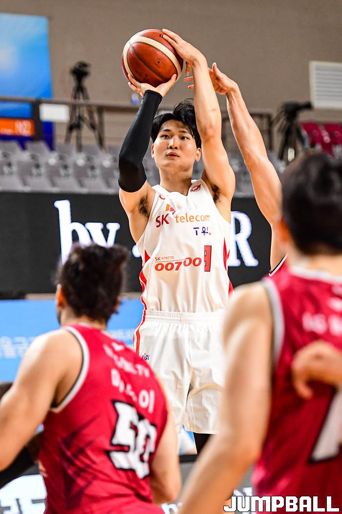 15일 경상북도 상주시 상주실내체육관에서 열린 2021 MG새마을금고 KBL 컵대회 서울 SK와 창원 LG의 경기, SK 안영준이 슛을 시도하고 있다.