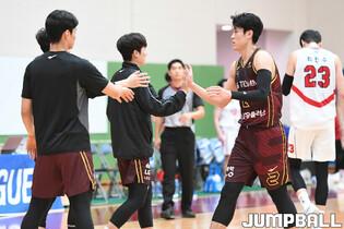 [점프볼=이천/박상혁 기자] 7일 경기도 이천에 위치한 LG챔피언스파크에서 열린 2023-2024 KBL D리그 수원 KT와 대구 한국가스공사의 경기,한국가스공사 선수단이 환호하고 있다.