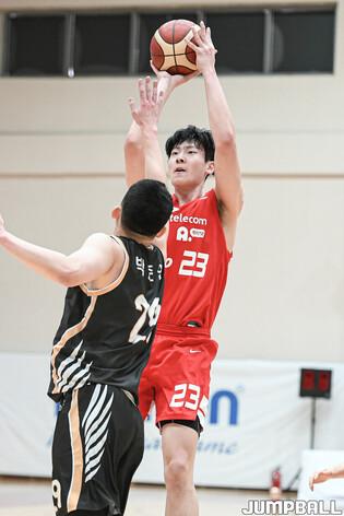 12일 이천 LG챔피언스파크에서 열린 2022-2023 KBL D리그 서울 SK와 상무의 경기, 상무 송교창이 3점슛을 성공시킨후 백코트 하고 있다.
