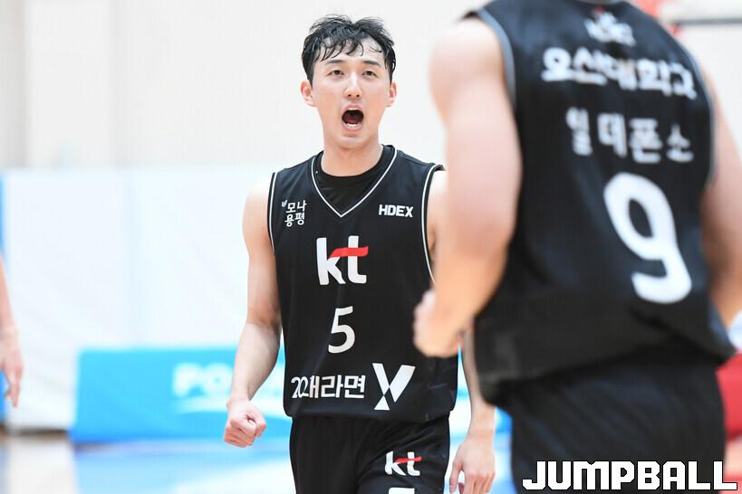 [점프볼=이천/박상혁 기자] 7일 경기도 이천에 위치한 LG챔피언스파크에서 열린 2023-2024 KBL D리그 수원 KT와 대구 한국가스공사의 경기,KT 최진광이 환호하고 있다.