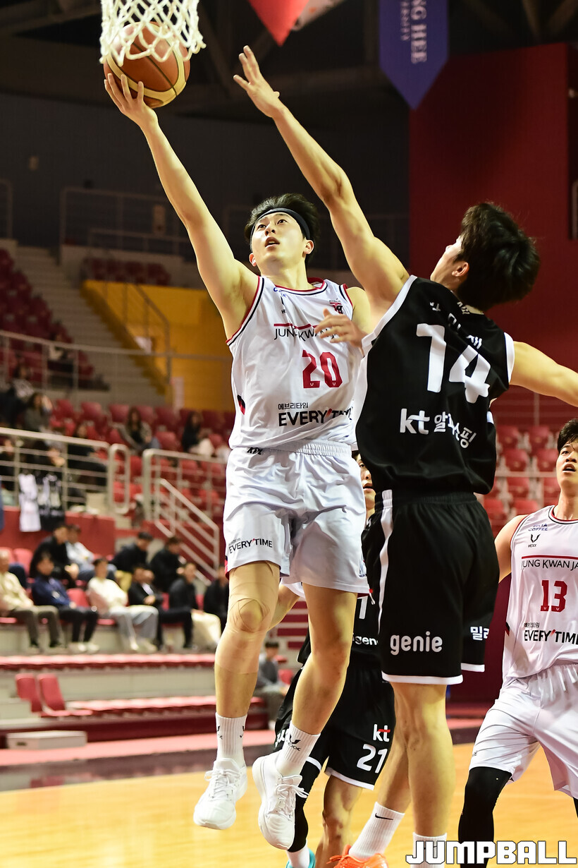 [점프볼=용인/박상혁 기자] 1일 경희대학교 국제캠퍼스 선승관에서 열린 2025-2026 KBL D리그 안양 정관장과 수원 KT의 3,4위전 경기, 정관장 소준혁이 레이업슛을 시도하고 있다.