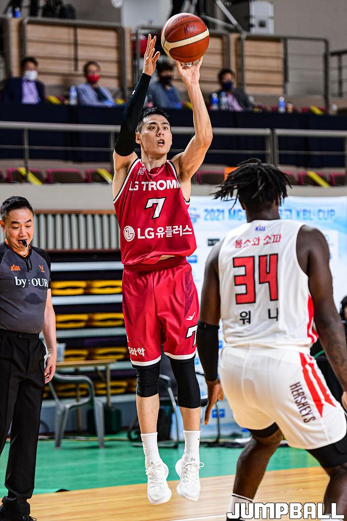 15일 경상북도 상주시 상주실내체육관에서 열린 2021 MG새마을금고 KBL 컵대회 서울 SK와 창원 LG의 경기, LG 이관희가 3점슛을 시도하고 있다.