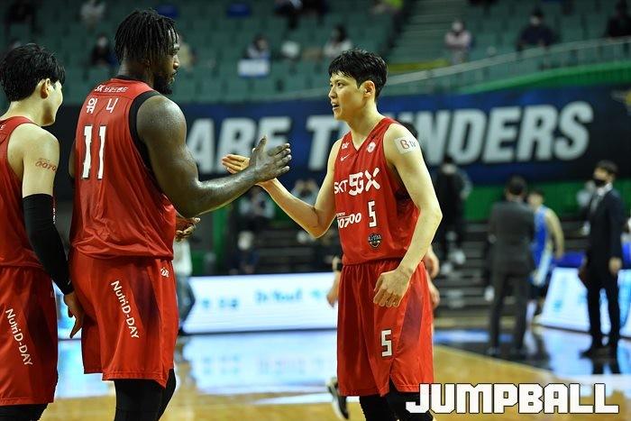 [점프볼=잠실/유용우 기자] 21일 잠실실내체육관에서 열린 2020-2021 현대모비스 프로농구 서울 삼성과 서울 SK의 경기, SK가 75-73으로 삼성에 원정 승리를 거두었다.