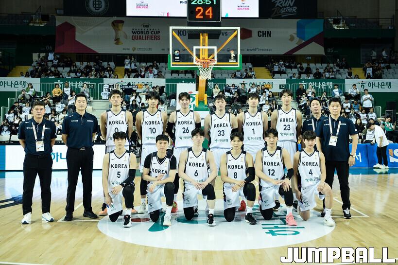 [점프볼=원주/유용우 기자] 1일 원주종합체육관에서 열린 2027 FIBA 농구 월드컵 아시아 예선 1라운드 한국과 중국의 2차전 경기, 한국 남자농구대표팀이 경기전 단체 촬영에 임하고 있다.