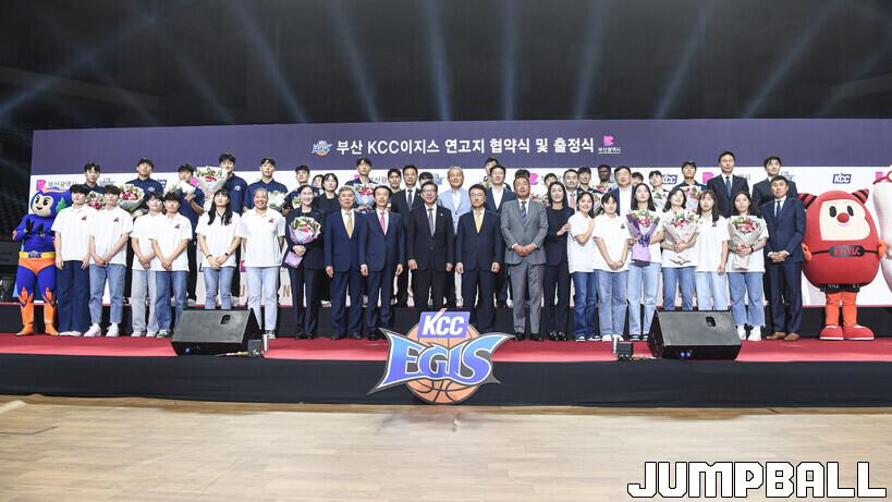 [점프볼=부산/박상혁 기자] 25일 부산사직체육관에서 진행된 부산KCC이지스 연고지 협약식 및 출정식, 협약식에 참석한 박형준 시장과 정재훈 구단주를 비롯해 박중묵 부산시의회 제1부의장, 김성주 BNK 구단주, 최영진 부산시의회 행정문화위원장, 송상조 부산시의회 행정문화위원회 부위원장, 최형길 KCC 단장, 김석규 BNK 단장, 전철우 부산농구협회장, 전진영 부산시 정무기획보좌관, 김기환 부산시 문화체육국장 그리고 KCC 선수단과 BNK 선수단이 기념 촬영을 하고 있다.