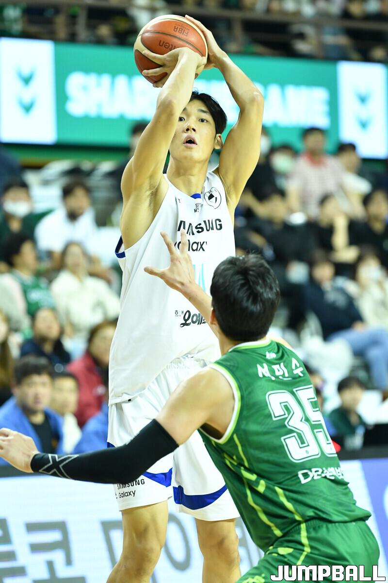 18일 원주종합체육관에서 열린 2023-2024 정관장 프로농구 원주 DB와 서울 삼성의 경기, 삼성 이원석이 슛을 시도하고 있다. [점프볼=원주/유용우 기자]