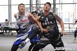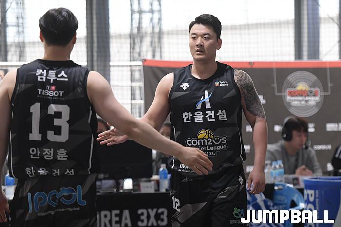[점프볼=고양/박상혁 기자] 2일 고양 스타필드 스포츠 몬스터 특설코트에서 열린 '컴투스 KOREA 3X3 프리미어리그 2020' 1라운드 경기, 한울건설 류지석과 안정훈이 하이파이브를 하고 있다.