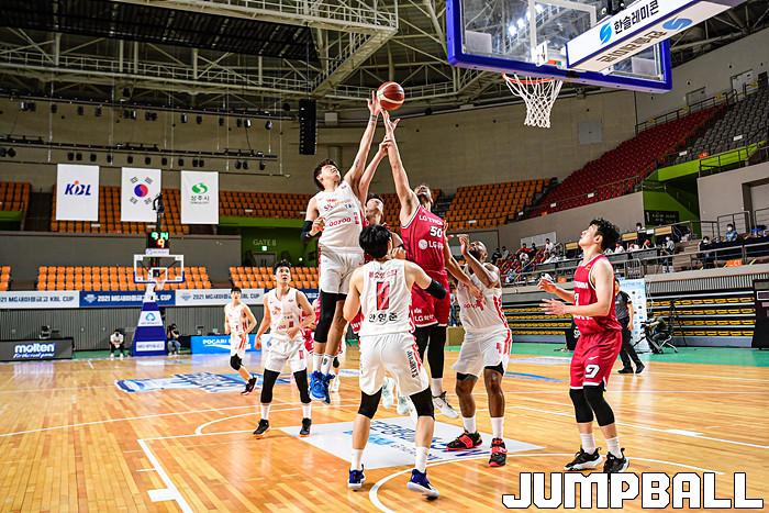 15일 경상북도 상주시 상주실내체육관에서 열린 2021 MG새마을금고 KBL 컵대회 서울 SK와 창원 LG의 경기, SK와 LG 선수들이 리바운드 다툼을 벌이고 있다.