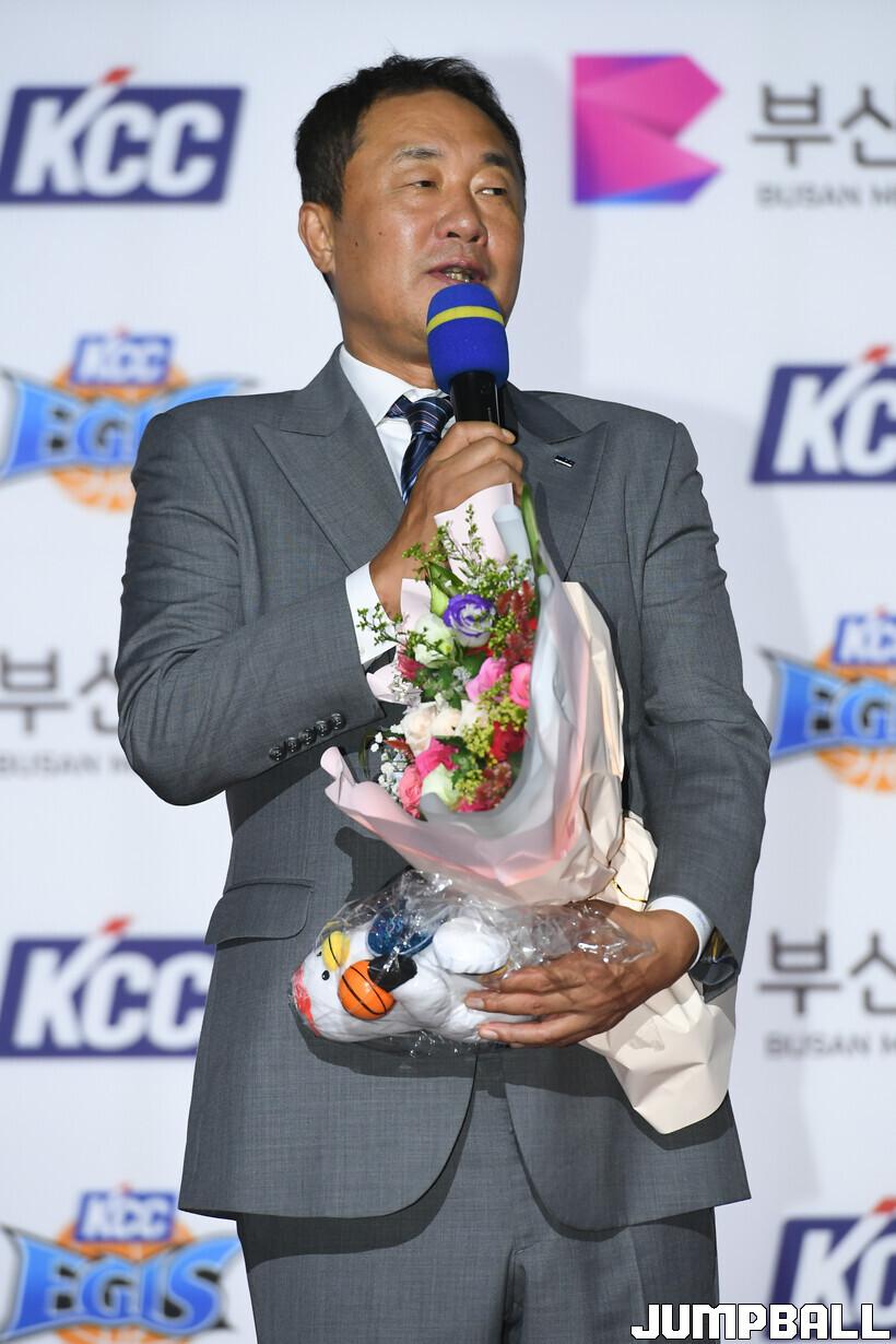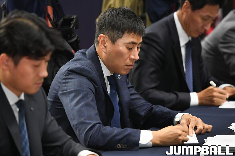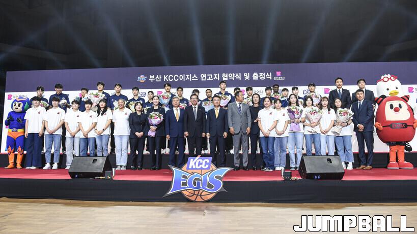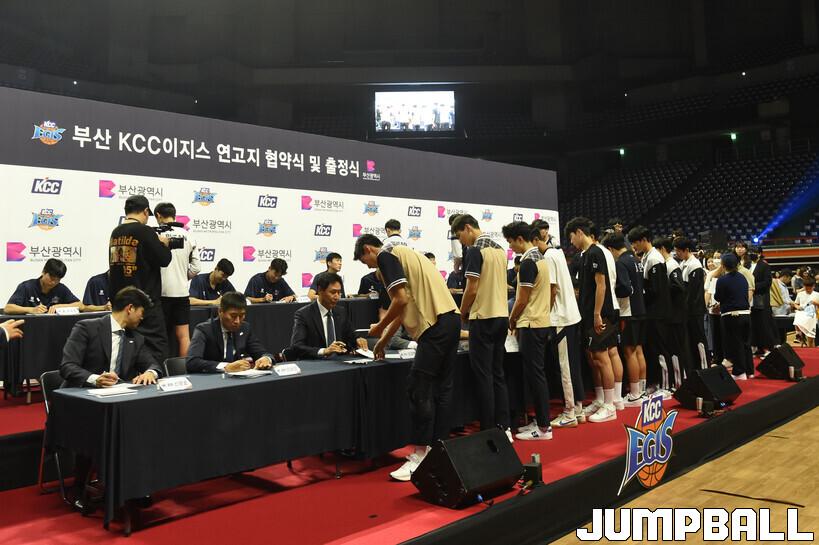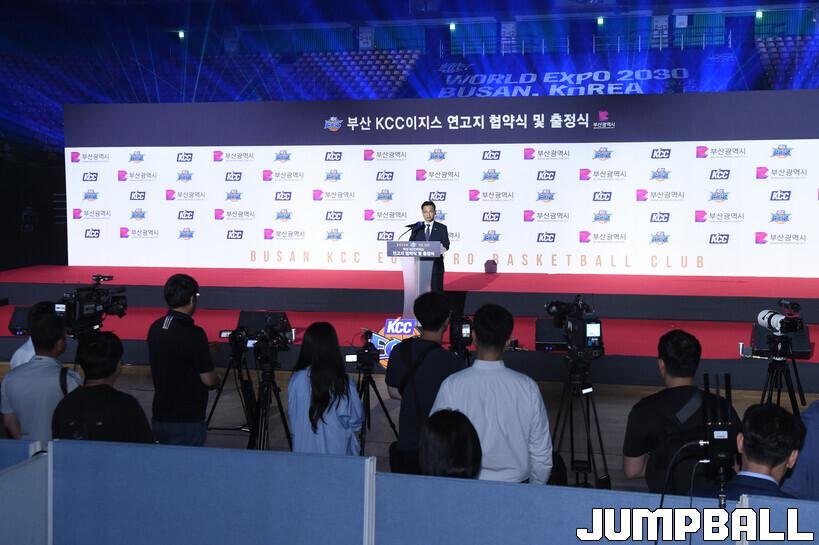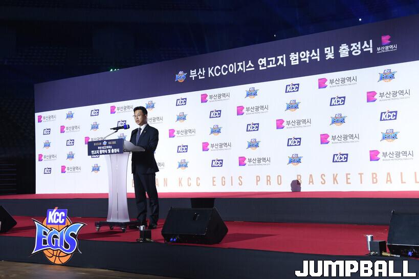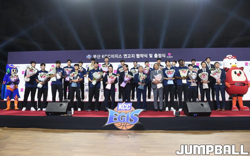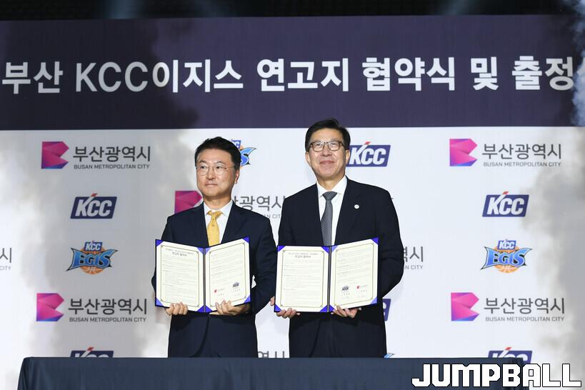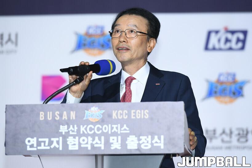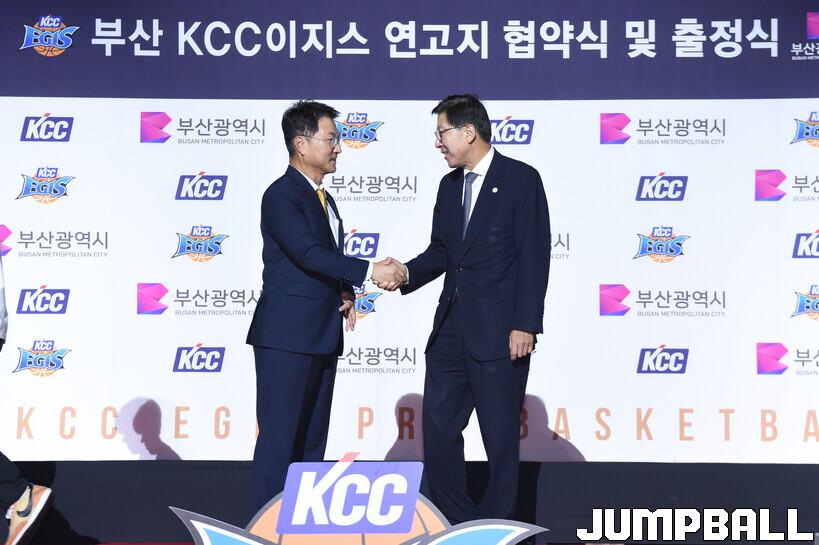 [점프볼=부산/박상혁 기자] 25일 부산사직체육관에서 부산KCC이지스 연고지 협약식 및 출정식이 있었다. 이날 협약식에는 박형준 시장과 정재훈 구단주를 비롯해 박중묵 부산시의회 제1부의장, 김성주 BNK 구단주, 최영진 부산시의회 행정문화위원장, 송상조 부산시의회 행정문화위원회 부위원장, 최형길 KCC 단장, 김석규 BNK 단장, 전철우 부산농구협회장, 전진영 부산시 정무기획보좌관, 김기환 부산시 문화체육국장 등이 참석했다.
