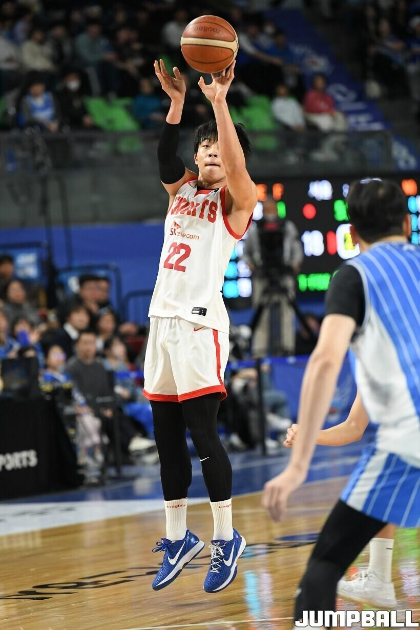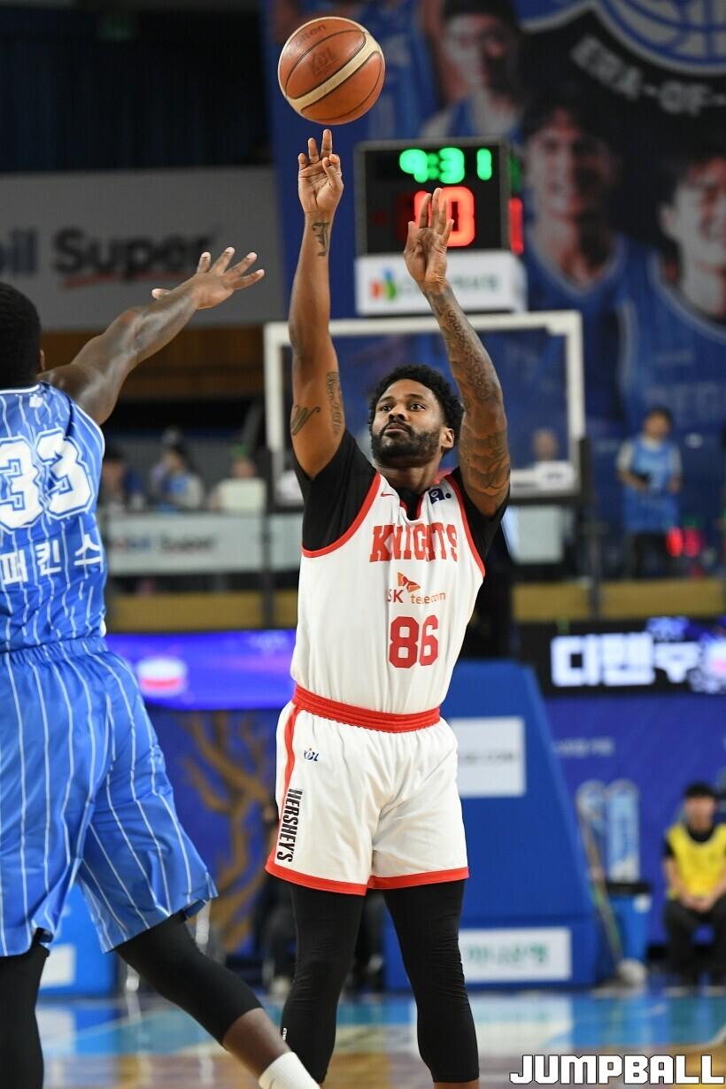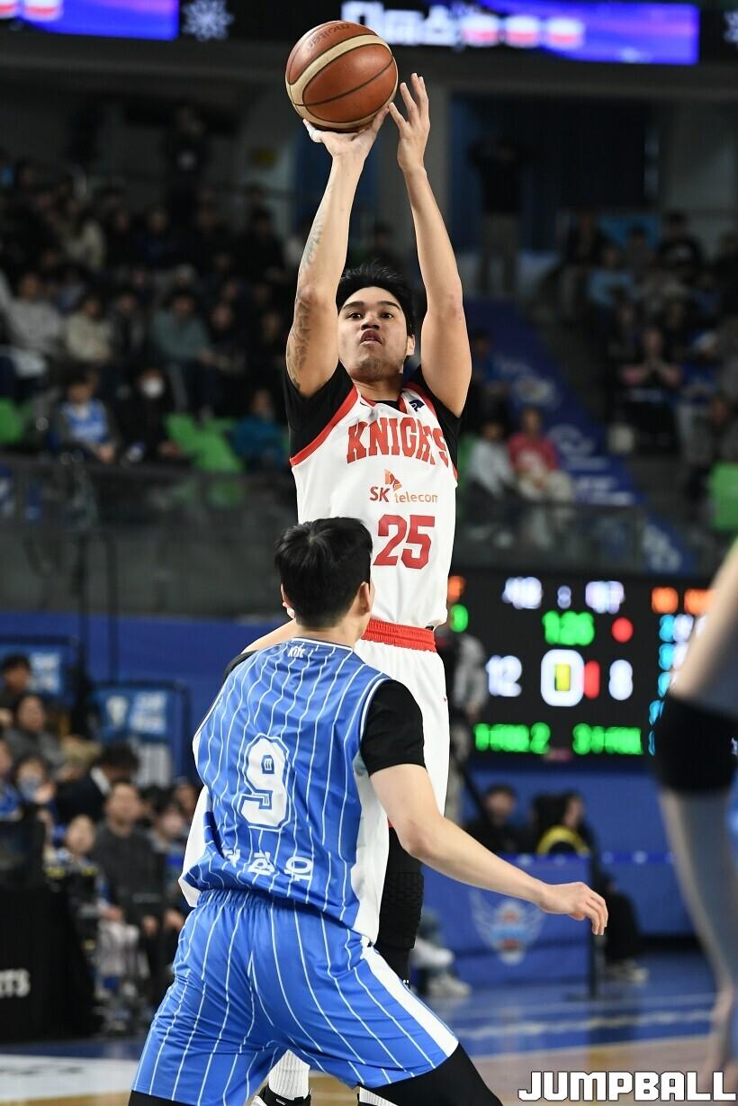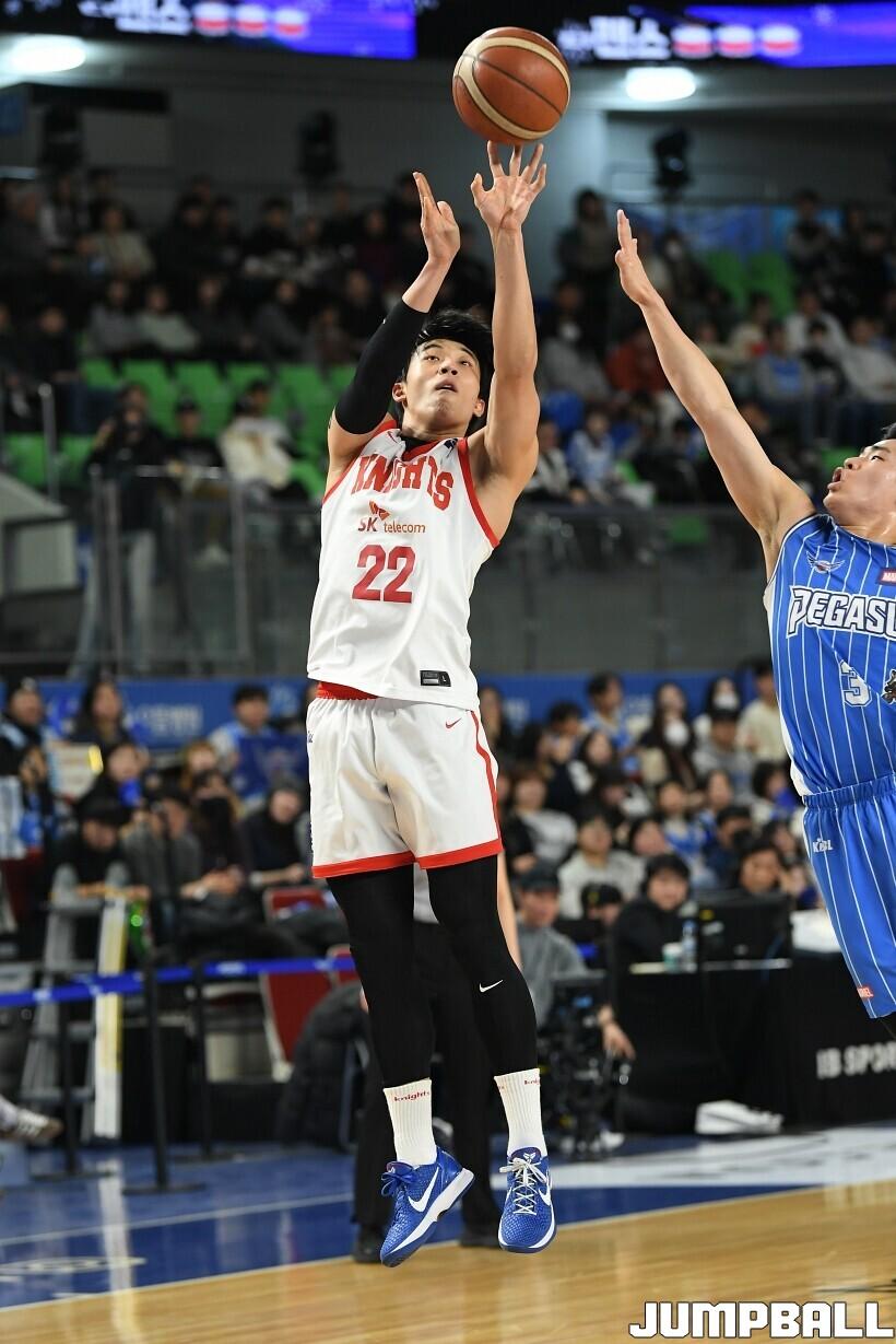 [점프볼=대구/유용우 기자] 27일 대구실내체육관에서 열린 2025-2026 LG전자 프로농구 대구 한국가스공사와 서울 SK의 경기, SK 안영준이 팁인슛을 성공시키며 66-65로 가스공사에 역전승을 거뒀다.