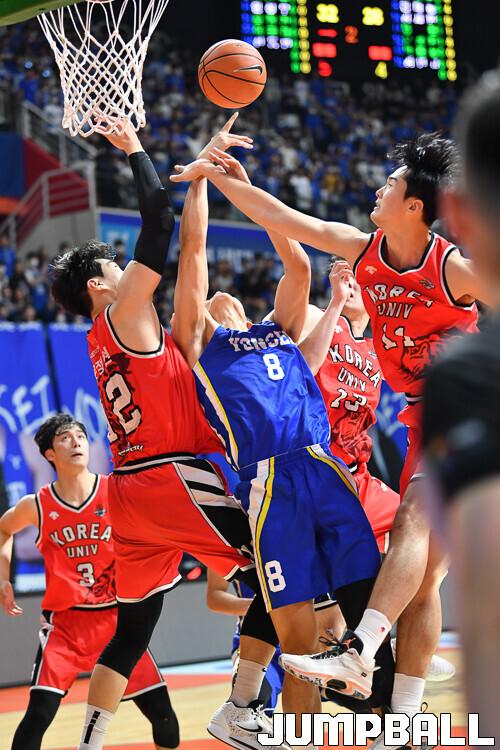 28일 고양실내체육관에서 열린 고려대와 연세대의 2022 정기전, 양팀 선수들이 치열한 공수대결을 펼치고 있다. [점프볼=고양/유용우 기자]
