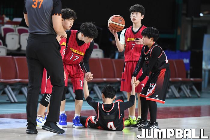 [점프볼=창원/박상혁 기자] 6일 창원실내체육관에서 열린 2020-2021 KBL 유소년 주말리그 C권역 U12 LG와 KT의 경기, KT 이태경과 LG 윤동욱이 KT 손영준을 일으켜 세워주고 있다.