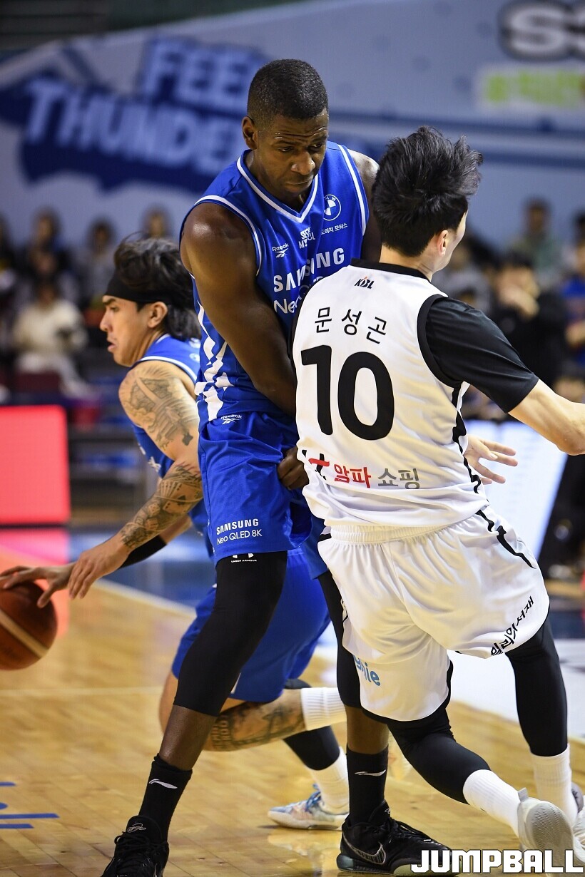 [점프볼=잠실/유용우 기자] 24일 잠실실내체육관에서 열린 2025-2026 LG전자 프로농구 서울 삼성과 수원 KT의 경기, 삼성 니콜슨이 구탕과 스크린 플레이를 펼치고 있다.