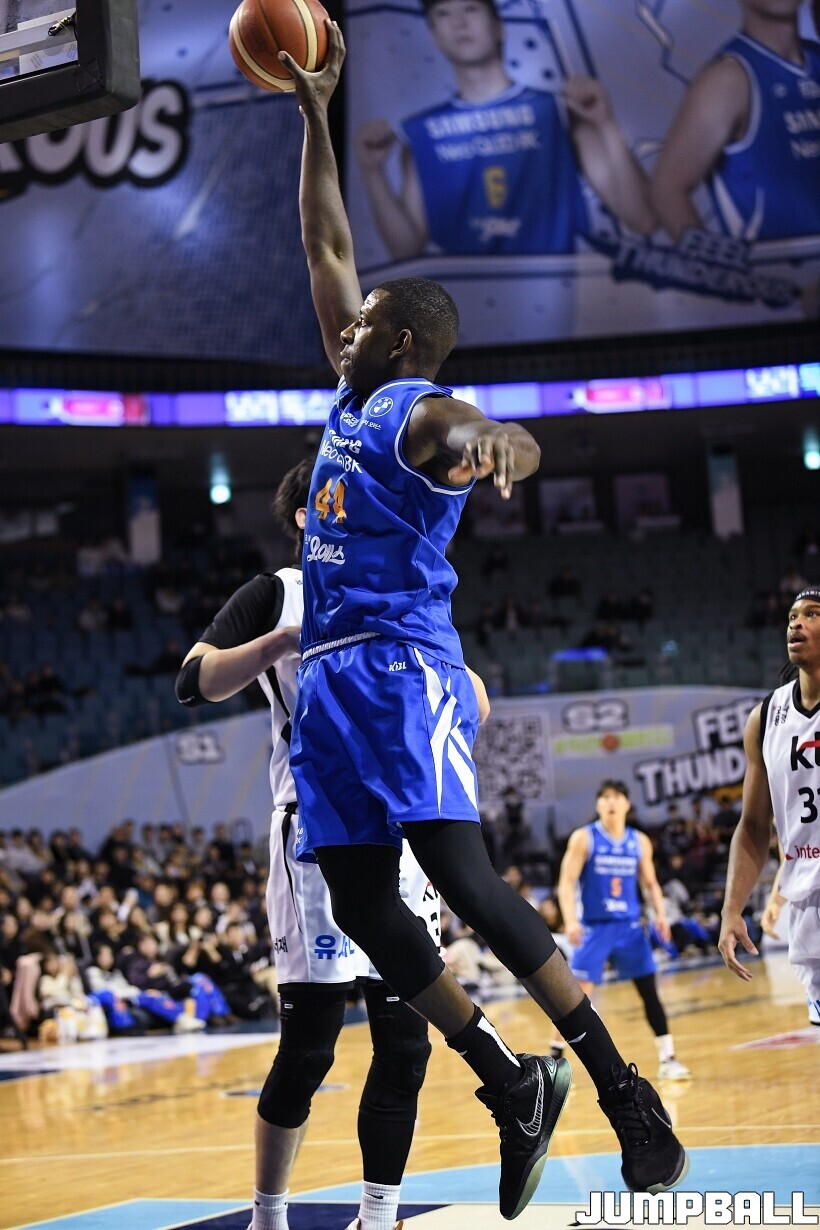 [점프볼=잠실/유용우 기자] 24일 잠실실내체육관에서 열린 2025-2026 LG전자 프로농구 서울 삼성과 수원 KT의 경기, 삼성 앤드류 니콜슨이 덩크를 시도하고 있다.