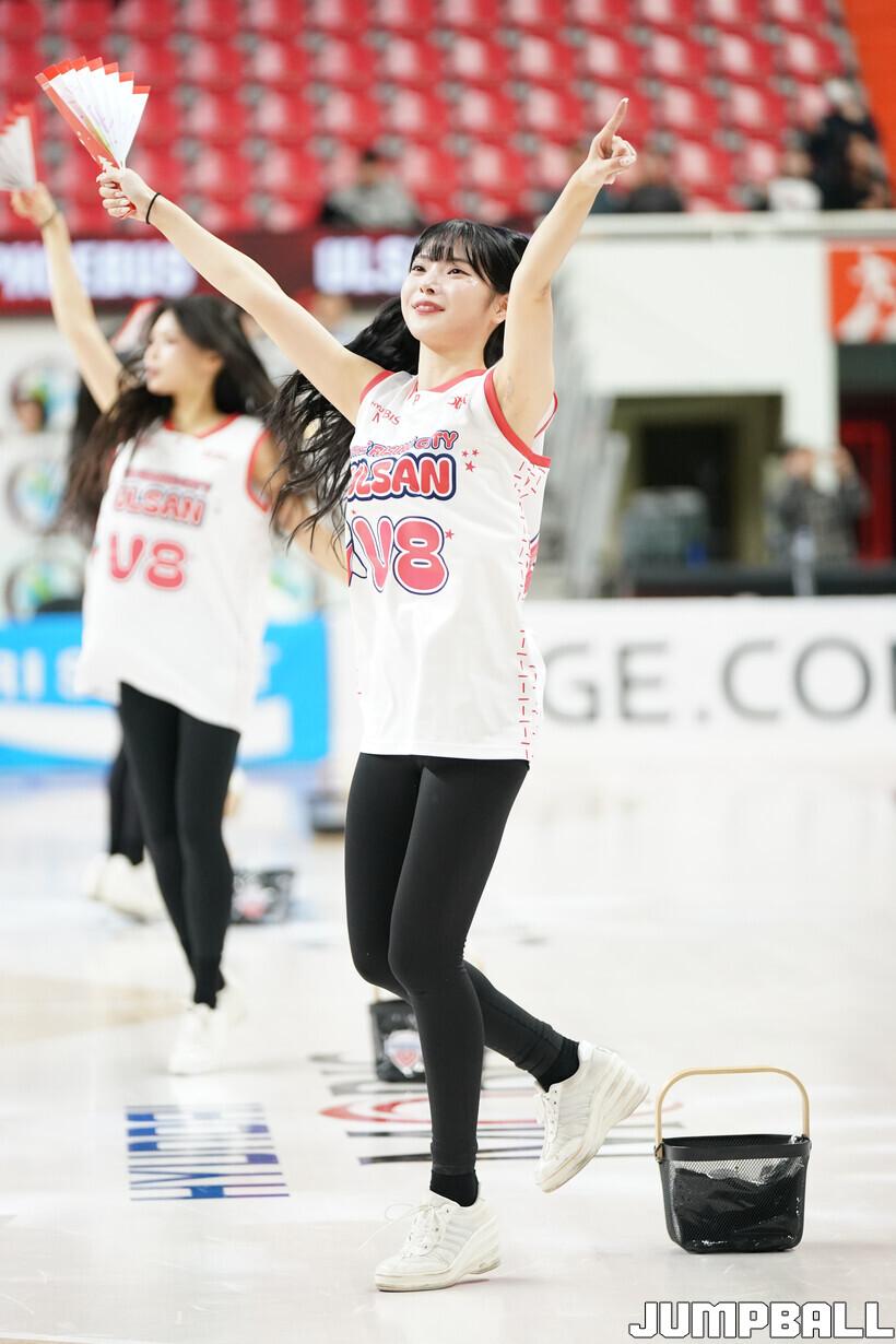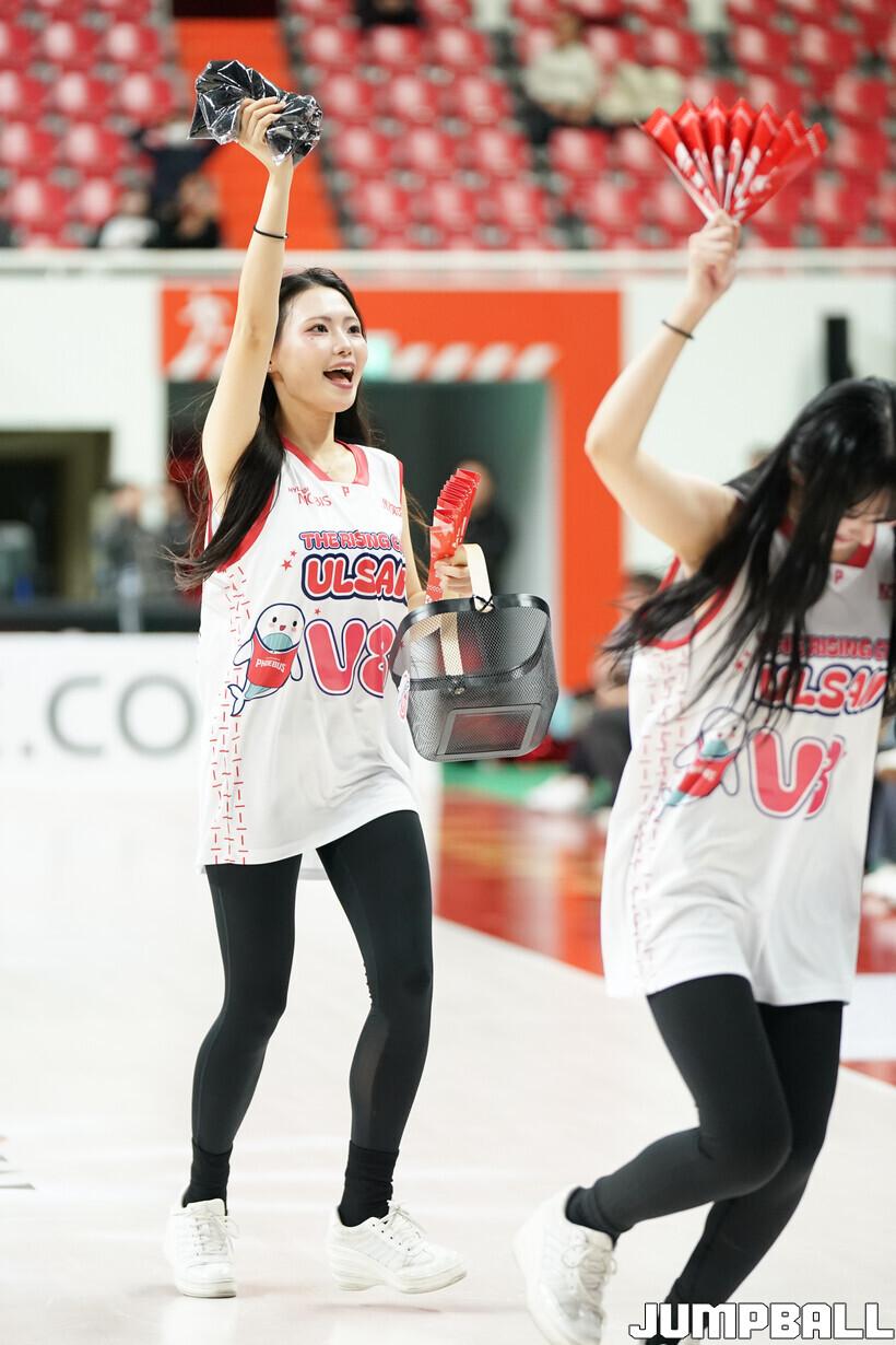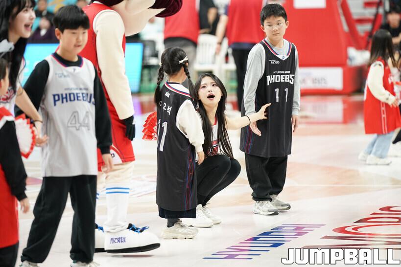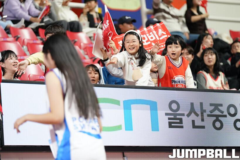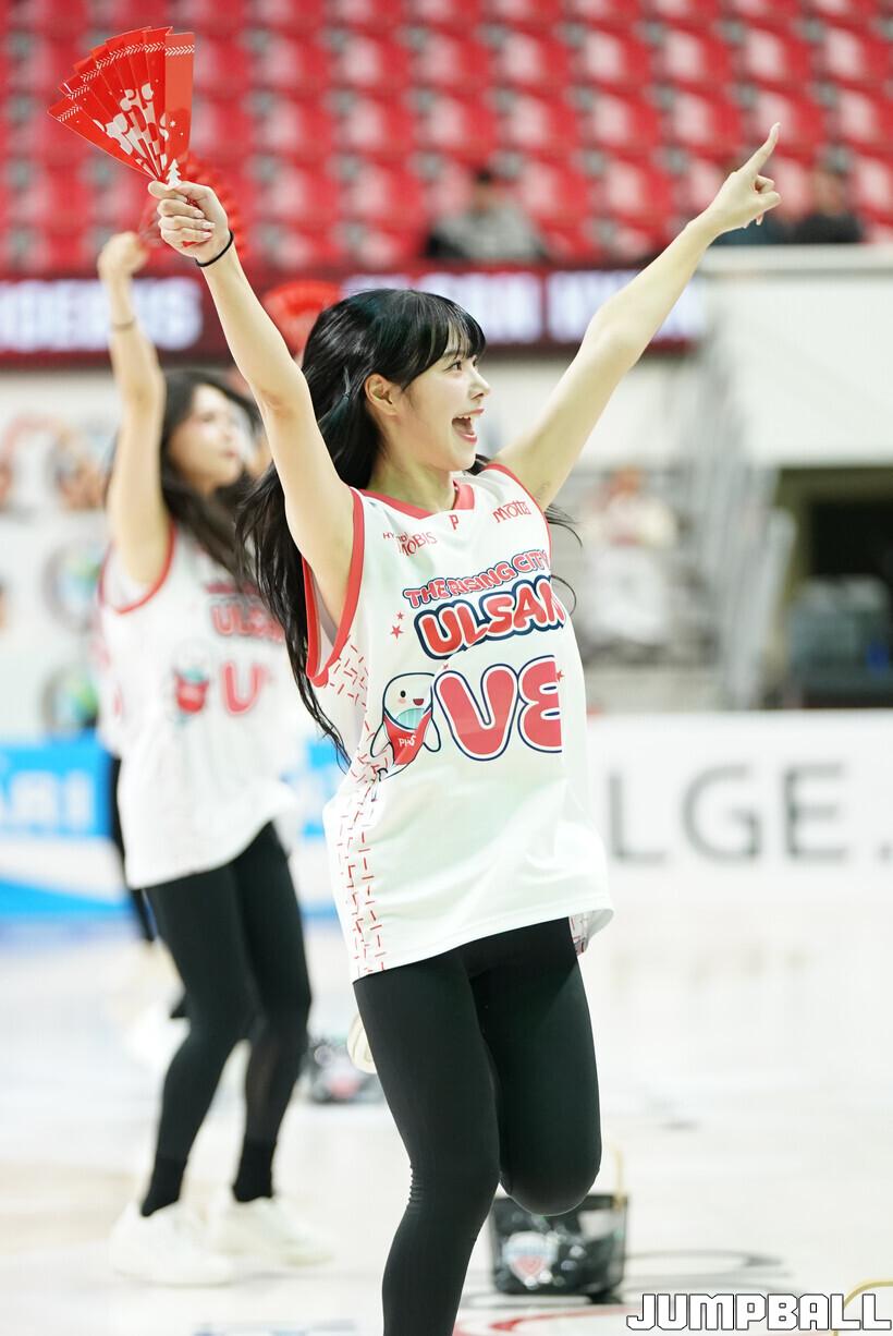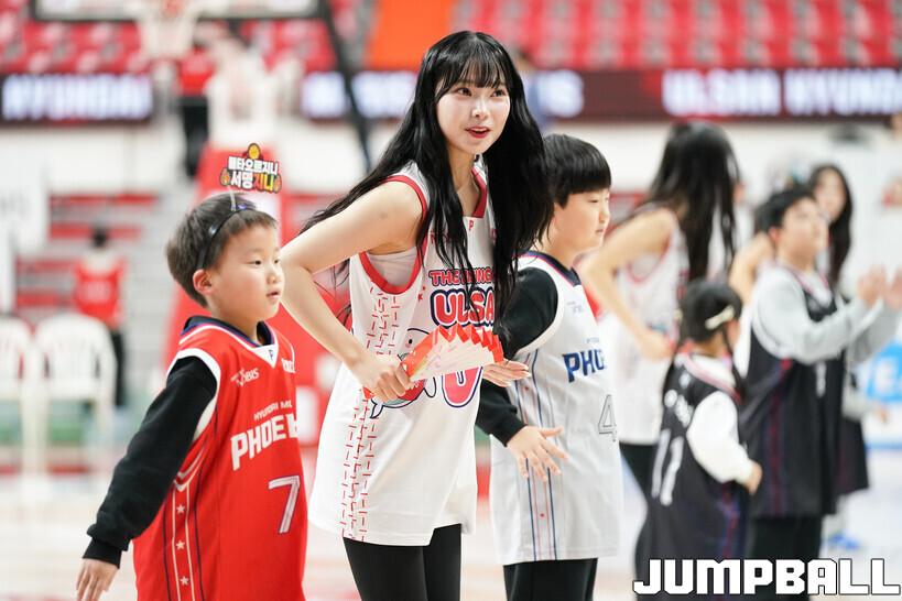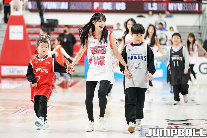[점프볼=울산/유용우 기자] 13일 울산 동천체육관에서 열린 2025-2026 LG전자 프로농구 울산 현대모비스와 서울 삼성의 경기, 현대모비스 치어리더들이 현대모비스 홈팬 어린이들과 호흡하며 다채로운 응원전을 펼치고 있다.