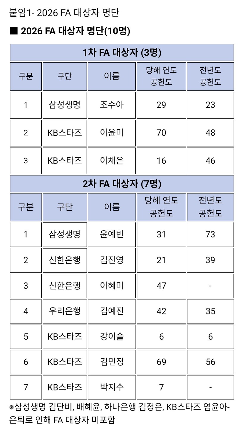 WKBL(한국여자농구연맹)은 29일(수) 보도자료를 통해 2026년 FA(자유계약선수) 대상자 10명을 확정했다.