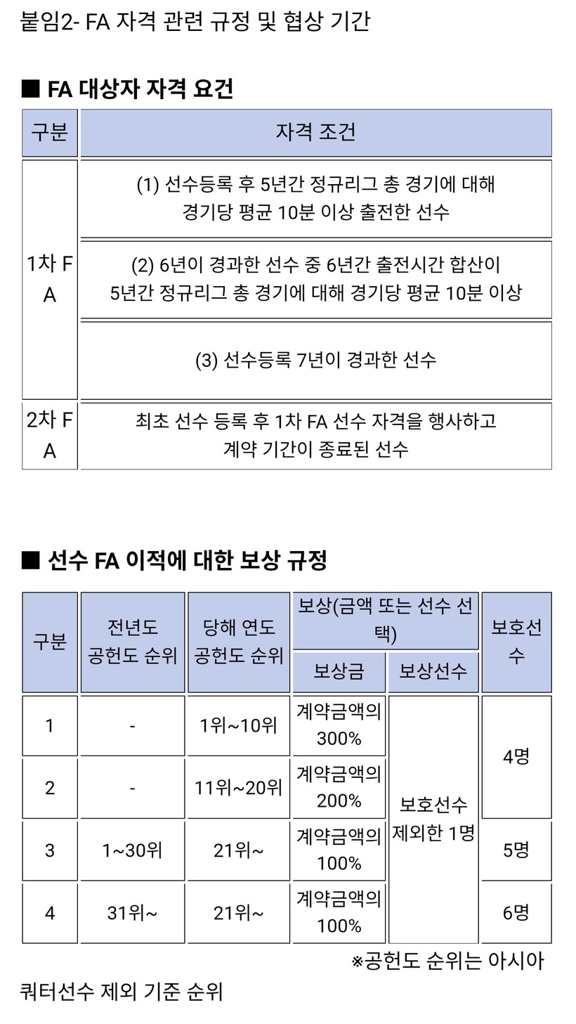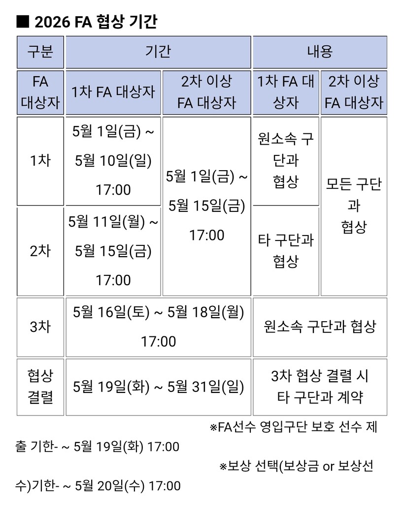 FA 협상은 총 3차에 걸쳐 진행된다. 1차 협상 기간은 5월 1일(금)부터 10일(일) 17시까지이며, 2차 협상 기간은 5월 11일(월)부터 15일(금) 17시까지다. 1, 2차 협상 기간 내 계약을 체결하지 못한 선수는 5월 16일(토)부터 18일(월) 17시까지 원소속 구단과 3차 협상을 진행한다.