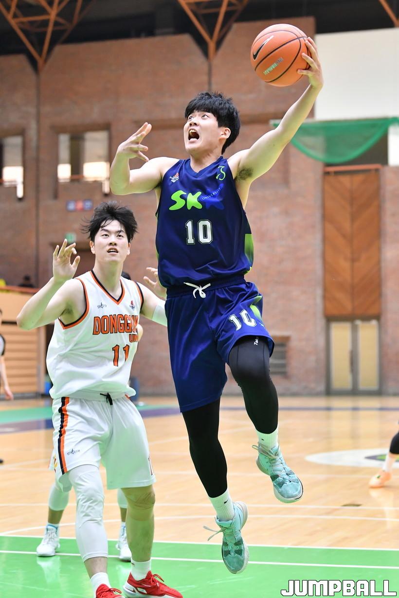 23일 수원 성균관대 자연과학캠퍼스 체육관에서 열린 2022 KUSF 대학농구 U-리그 성균관대와 동국대의 경기. 성균관대 안정욱이 수비를 돌파한 후 골밑슛을 시도하고 있다.