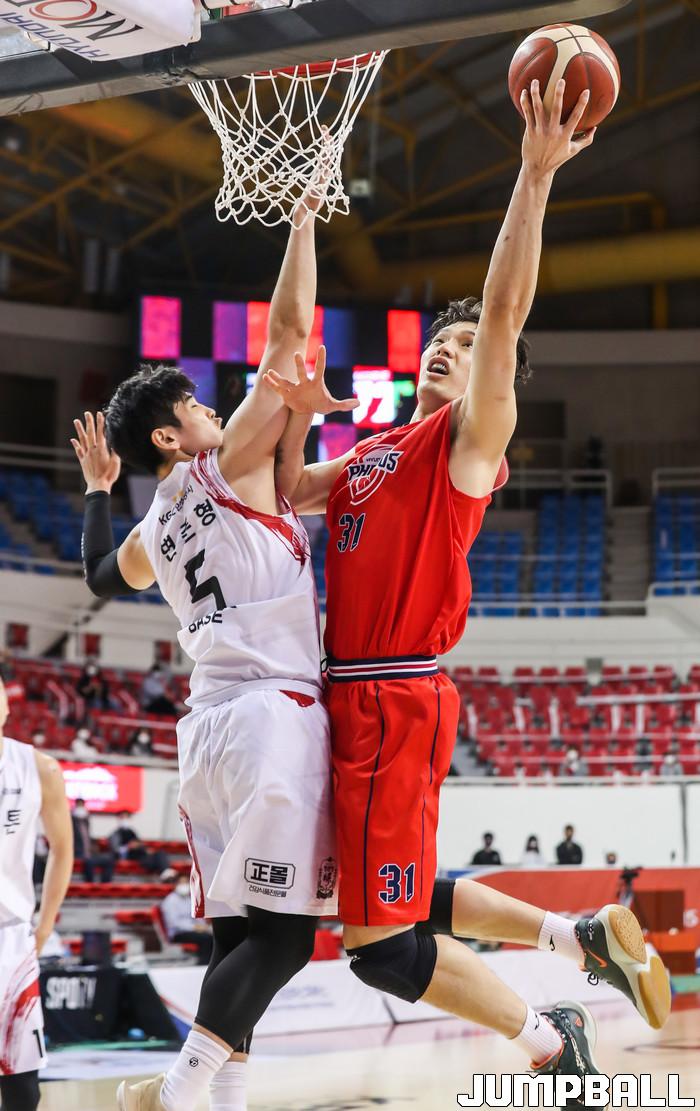 [점프볼=윤민호 기자] 18일 울산 동천체육관에서 열린 2020-2021 현대모비스 프로농구 울산 현대모비스와 안양 KGC의 경기에서 현대모비스 장재석이 KGC 변준형의 수비를 피해 슛을 하고 있다.