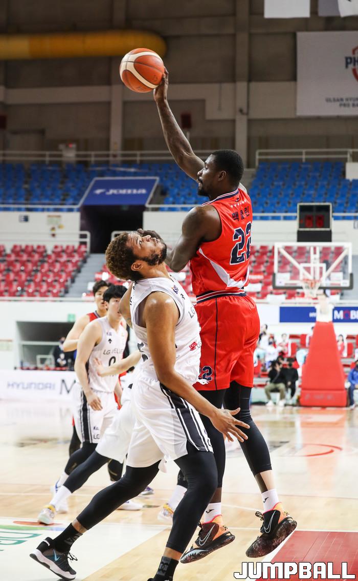 [점프볼=윤민호 기자]울산 현대모비스는 11일 울산동천체육관에서 열린 2020~2021 현대모비스 프로농구 창원 LG와 홈 경기에서 84-73으로 이겼다.