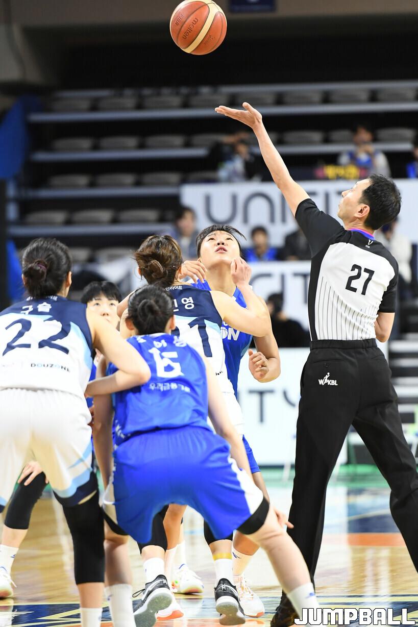 [점프볼=아산/박상혁 기자] 23일 아산이순신체육관에서 열린 우리은행 우리WON 2023-2024 여자프로농구 우리은행과 신한은행의 경기, 점프볼로 경기가 시작되었다.