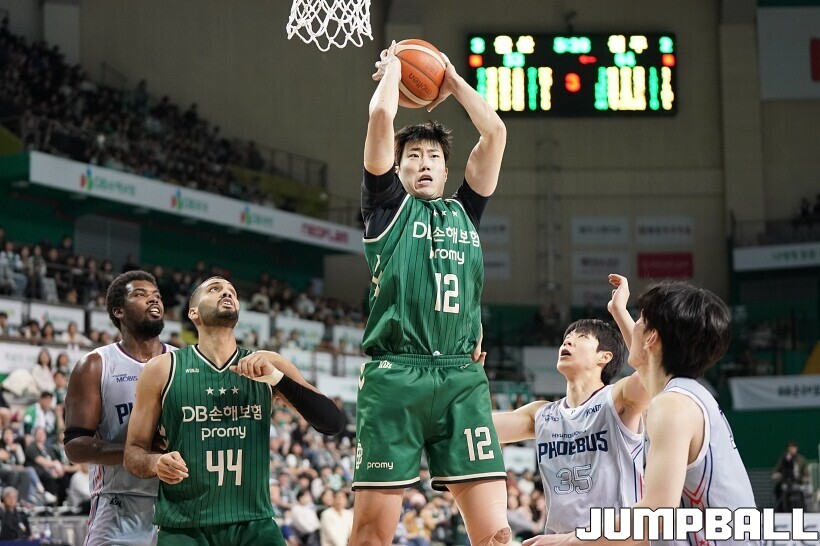 [점프볼=원주/유용우 기자] 16일 원주DB프로미아레나에서 열린 2025-2026 LG전자 프로농구 원주 DB과 울산 현대모비스의 경기, DB 정효근이 골밑에서 리바운드를 잡고 있다.