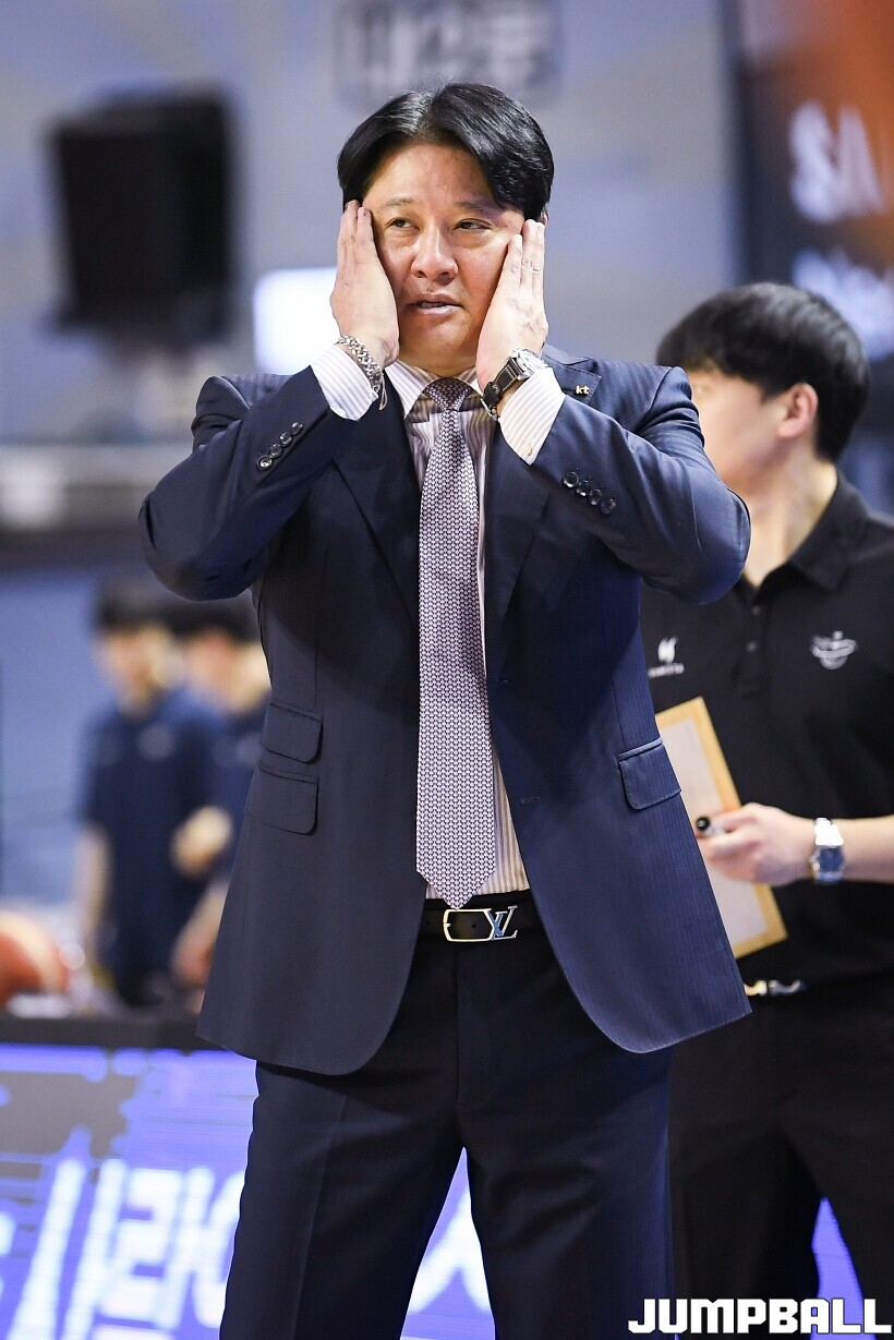 [점프볼=잠실/유용우 기자] 24일 잠실실내체육관에서 열린 2025-2026 LG전자 프로농구 서울 삼성과 수원 KT의 경기,KT 문경은 감독이 진땀승을 거두며 안도하고 있다.