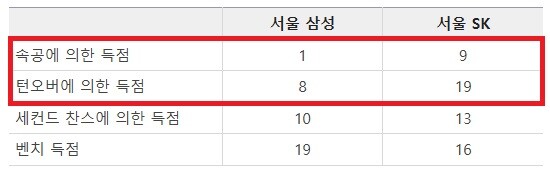 더 눈에 띄는 기록은 실책을 속공으로 연결하는 과정이었다. SK가 오재현, 안영준, 워니 등 속공에 특화된 선수가 즐비한 반면, 속공 9위(3.3개) 삼성은 저스틴 구탕마저 뇌진탕 증세로 16분 44초를 소화하는 데에 그쳐 속공 전개에 어려움을 겪었다.