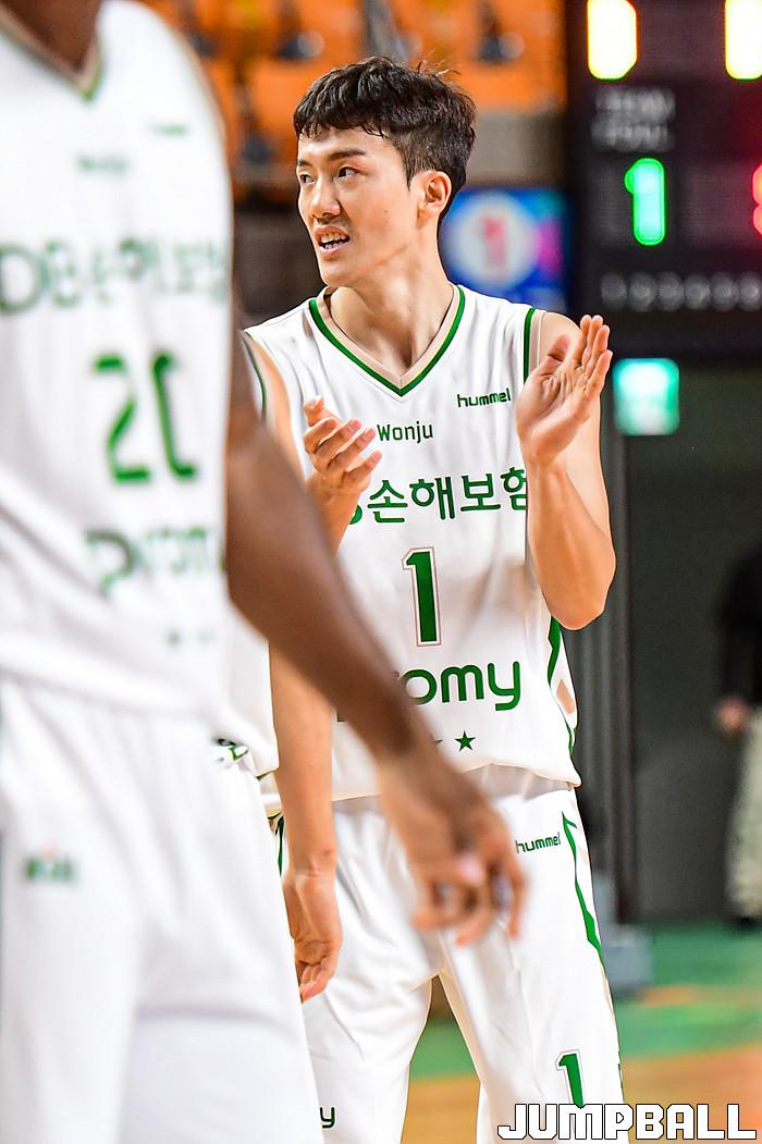 15일 경상북도 상주시 상주실내체육관에서 열린 2021 MG새마을금고 KBL 컵대회 원주 DB와 한국가스공사의 경기, DB 박찬희가 선수들을 격려하고 있다.