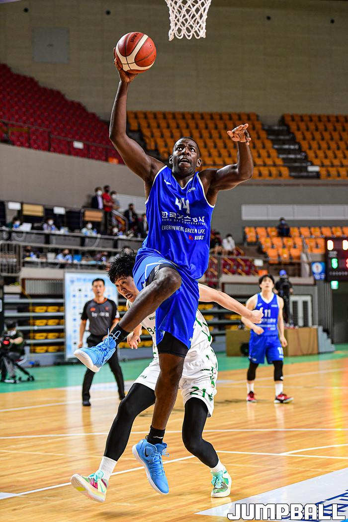 15일 경상북도 상주시 상주실내체육관에서 열린 2021 MG새마을금고 KBL 컵대회 원주 DB와 한국가스공사의 경기, 한국가스공사 앤드류 니콜슨이 덩크슛을 시도하고 있다.