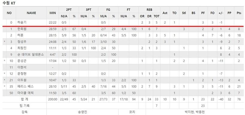 5개의 야투를 시도했지만 모두 빗나갔다. 5개의 리바운드와 2개의 어시스트만 기록했다. 하윤기는 루키시즌인 2021-2022시즌에만 6차례 0점을 기록했을 뿐 2022-2023시즌부터 올 시즌까지 0점 경기가 한번도 없었다. 2022년 4월 2일 고양 오리온과의 경기가 마지막 0점이다. 리그를 대표하는 빅맨으로 올라선 이후에는 한 번도 0점 경기가 없었다.