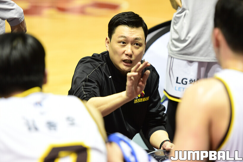 [점프볼=용인/박상혁 기자] 1일 경희대학교 국제캠퍼스 선승관에서 열린 2025-2026 KBL D리그 창원 LG와 상무의 결승전 경기, LG 김동우 코치가 선수들에게 작전 지시를 하고 있다.